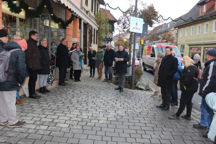 Vor ihren früheren Häusern am Markt Nr. 7 und in der Coburger Str. 1 erinnern heute STOLPERSTEINE an das Schicksal der beiden Familien Sachs und Strauß, die vor Hitler und den Nationalsozialisten aus ihrer Heimat Deutschland fliehen mussten.