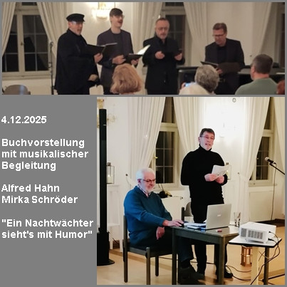 Am 4.12.2025 stellten Alfred Hahn (Autor) und Mirka Schröder (Illustrationen) ihr Buch "Ein Nachtwächter sieht's mit Humor" vor. Es ist als Band 49 der Schriften des Rückertkreises erschienen.