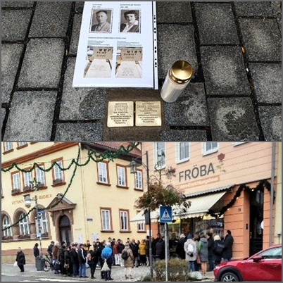 Vor ihren früheren Häusern am Markt Nr. 7 und in der Coburger Str. 1 erinnern heute STOLPERSTEINE an das Schicksal der beiden Familien Sachs und Strauß, die vor Hitler und den Nationalsozialisten aus ihrer Heimat Deutschland fliehen mussten.