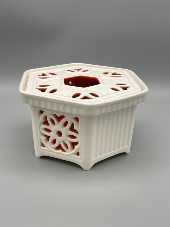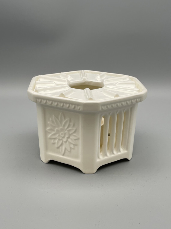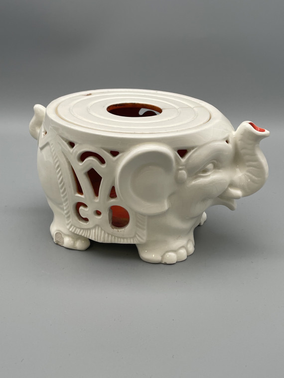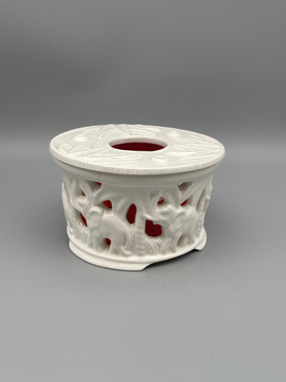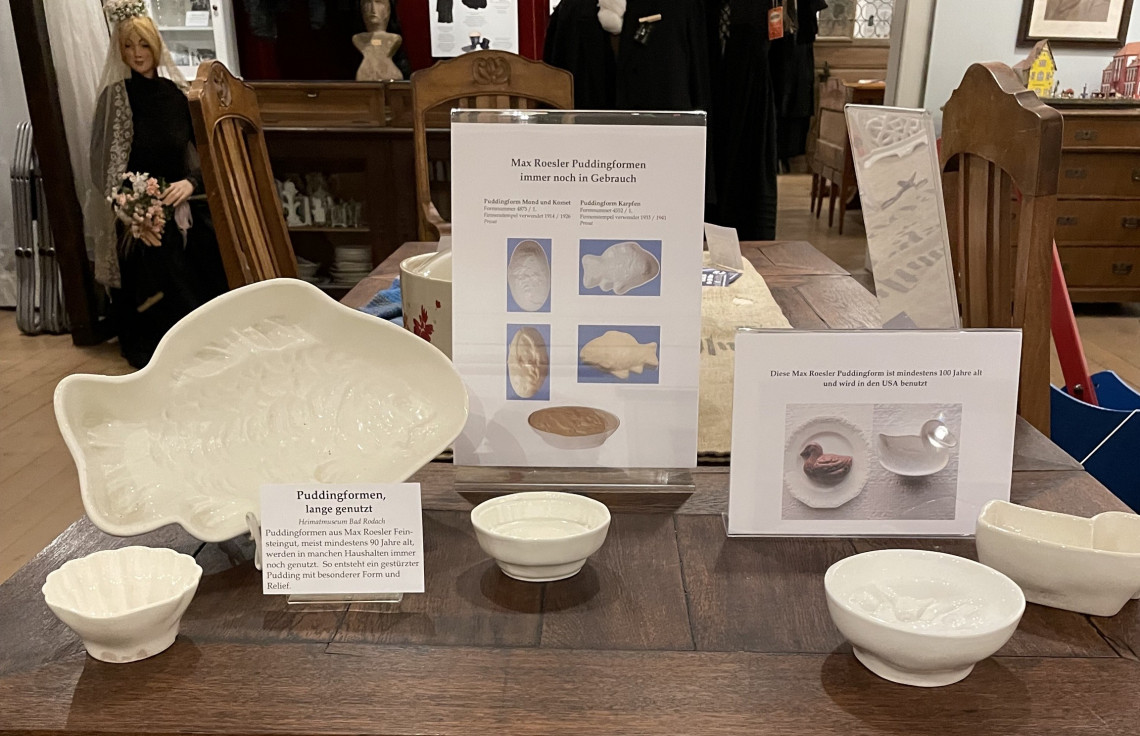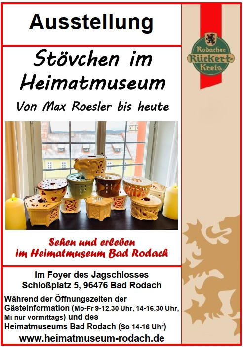 Unter den Erzeugnissen der Max Roesler Feinsteingutfabrik in Rodach (1895-1943) sind Stövchen erst in den 1930er Jahren vertreten, dann aber sehr variantenreich. vor allem bei der Gestaltung der Seitenwände – von traditionsreichem Flechtwerk und Durchbrucharbeiten bis zur plastischen Gestaltung als Elefant. Einen großen Teil der Stövchen aus dem Prospekt „Gifts“ (Geschenke) von 1937 zeigten wir in der Ausstellung im Foyer des Jagdschlosses und in den Räumen des Heimatmuseums.