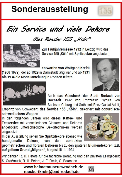 Zur Frühjahrsmesse 1932 in Leipzig wird das Service 155 „Köln“ mit Spritzdekor angeboten, entworfen von Wolfgang Kreidl (1906-1972), der ab 1929 bei Roesler in Darmstadt tätig war und ab 1931 bis 1934 die Modellabteilung in Rodach leitete.