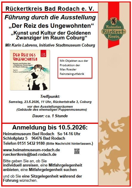 Bilder aus dem alten Rodach, eine Sonderausstellung der Hobby Künstlerin Doris Weiß, Kirchweihpredigten vorgetragen von Christa Gilbert und eine Präsentation von Clara Lange über die Enstehung der ThermeNatur Bad Rodach können Sie unter dem folgendem Link finden: Rückertkreis Bad Rodach You Tube Kanal